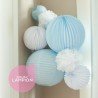 Un lot de lampions, lanterne en dentelle et pompons dans les tons bleu pâle et blanc doux (avec kit d'accroche). Fait à la main.