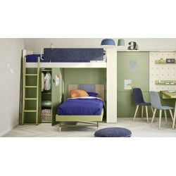 The bed can be customised with a wide range of colours, fabric upholstery options, and several ladder or staircase designs with open compartments or drawers.